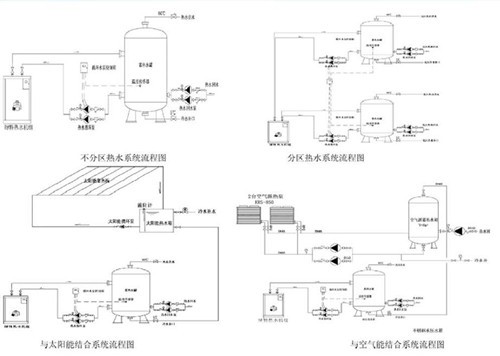太陽能集熱板放在樓頂,加熱太陽能熱水箱,太陽能熱水箱的供水作為蓄熱水罐的補水,如溫度不夠,中央熱水機組自動啟動加熱。
